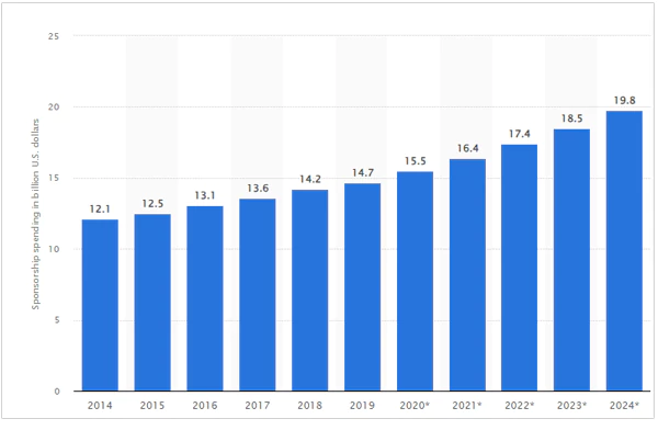 The latest graph below shows the increasing sports sponsorship on a global scale since 2014. Many private organizations are eager to invest in talented college sports players to play internationally.